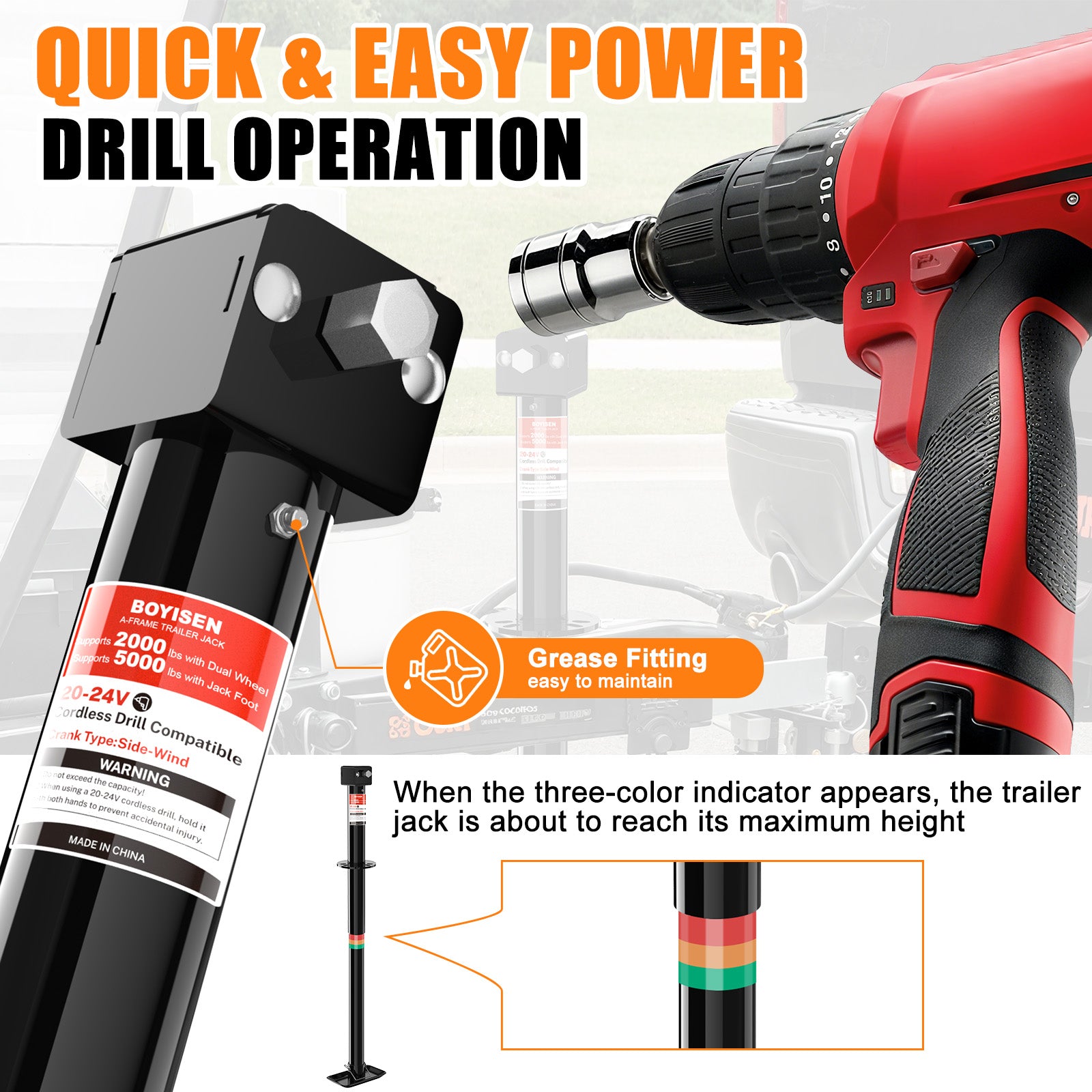 - OPTIMIZED 14" LIFT RANGE: Provides a practical 14-inch height adjustment range to aid in coupling and uncoupling on uneven ground. The smooth lifting mechanism ensures precise control whether using drill power or manual operation
